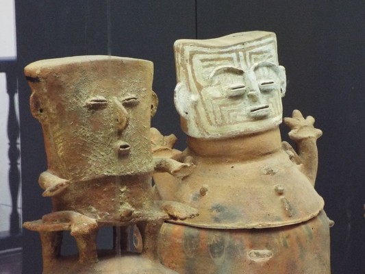 Colombia - Cartagena - Museo del Oro - de gezichten hebben patroon, wellicht om de sociale status van de dode aan te geven .......