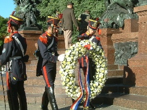 "..........“Is er geen krans?” informeert een geuniformeerde. Die is er, maar waar is dat ding? Even later wordt de krans, voorzien van een rood-wit-blauw lint met een gekroonde B erop, vanuit de achterhoede aangereikt. De kranslegging wordt geoefend. De geuniformeerde geeft, voor zover ik dat kan beoordelen redelijk zinloze, regie aanwijzingen aan zijn in kleurig ceremonieel tenue gestoken ondergeschikten. .........."