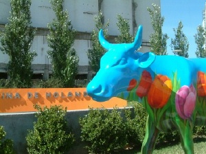 "..............Die jongens en meisjes van de ambassade hebben er in ieder geval voor gezorgd – zo vermoed ik – dat de oerlelijk grijze muur op de al even oerlelijke Plaza Reina de Holanda voor de gelegenheid oranje is geverfd. Het plein ligt naast de ambassade en je weet maar nooit of je werkgever op kantoor zal langs komen. De Ambassadeur is en blijft uiteindelijk Harer Majesteits Ambassadeur. Op hetzelfde plein is een door het Ministerie van Landbouw gesponsord kunstwerk, een met fleurige tulpen beschilderde koe, geplaatst..............."