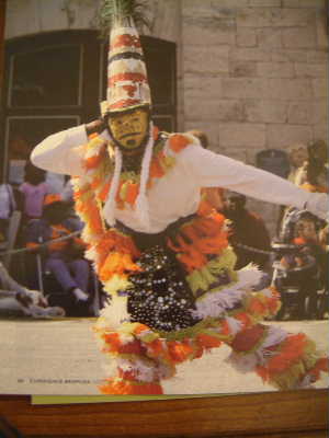"............ Hoewel. In het vliegtuig las ik een artikel over de Gombeys. Gemaskerde dansers die volgens de illustratie er bijna net zo uitzien als de gemaskerde dansers die ik lang geleden zag in Porto Novo in het West-Afrikaanse land Benin. Wie weet, zouden die wel zijn te zien. ..............."
