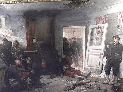 "........... Dat gaat zonder meer op voor het in 1873 geschilderde “Les Dernières Cartouches” waarop één van de kamers op de eerste verdieping van de auberge in Bazeilles is afgebeeld waar de mariniers zich hadden verschanst. ............."