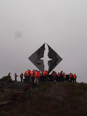 "........... Rond het monument hangt een zwerm in rode zwemvesten geklede toeristen, die zich vrijwel zonder uitzondering laten vereeuwigen alsof ze zonet de heldendaad van onze landgenoten uit de zeventiende eeuw hebben herhaald. ............."