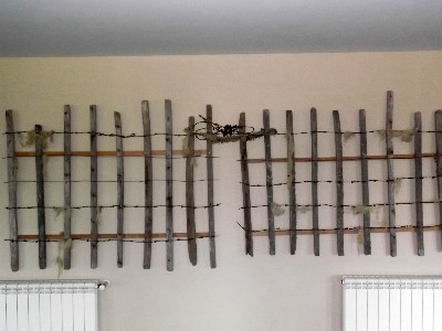 "........... . Zoals die kunstwerken in het zuiden waarin wol – iets dat daar volop beschikbaar is - is verwerkt: paaltjes met over dwars prikkeldraad waarin ruwe wol is blijven hangen. ............."