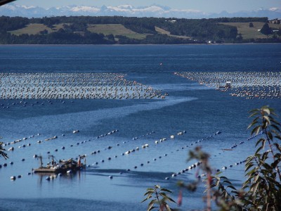 "........... In de baai strak geordende vierkanten die worden gevormd door de drijvers die in het water dobberen en waaronder, zo veronderstellen we, oesterbedden hangen. ............."