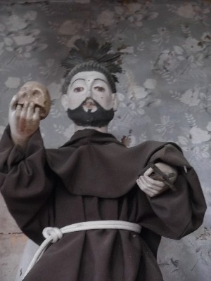 "........... de goed ogende monnik met een ringbaardje en een schedel in zijn rechter hand, ............."