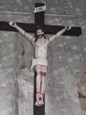 "........... Jezus aan het kruis met zulke dikke wallen rond de ogen dat het erop lijkt dat ie een fondsbrilletje op heeft. ............."