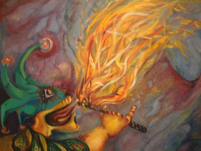 "........Jammer genoeg is de kunstenares niet zover gegaan om uit de muur waaraan “de Vuurspuwer” hangt om de paar minuten een steekvlam te laten blazen. Of misschien mocht dat gewoon niet van de “autoriteiten” wegens het mogelijke brandgevaar............"