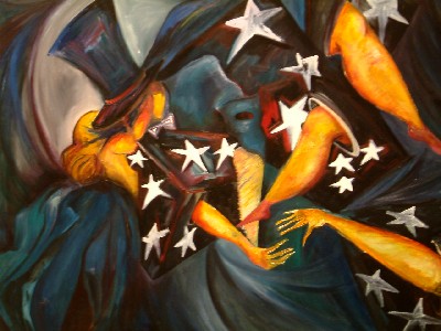 "......Rond het doek “de Magiër en zijn assistente” hangen dobbelstenen. De goochelaar en zijn assistente zijn verstrengeld in een vurige omhelzing, magie op meerdere niveaus. ........"