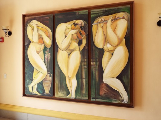 "........ zijn de niet te missen abstracte wanddecoraties. Daarop staan alleen maar ongeklede XL-vrouwen afgebeeld, die in een onmogelijke houding een instrument bespelen. ......."