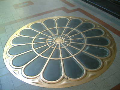 ".......... Op regelmatige afstanden in de vloer liggen grote, op bloemen lijkende, ramen van melkglas. Die moeten wat licht doorlaten naar de onderwereld – het souterrain in wereldse termen – doch zijn door de architect bedoeld om het hellevuur te suggereren. ..............."