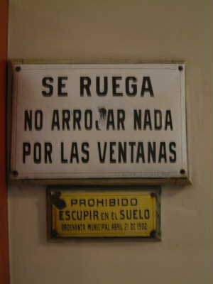 ".......... Het enige wat opvalt zijn twee verbodsbordjes. Eén waarop wordt verzocht geen vuil uit de ramen te gooien, een tweede met het verbod om op de grond te spugen (Gemeentelijke Verordening van 2 april 1902). ..............."
