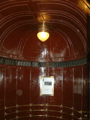 ".......... De rondleider wijst op wat vrijmetselaars symbolen, waarna we de met bordeauxrode panelen en koper beklede lift naar de 14e verdieping nemen. ..............."