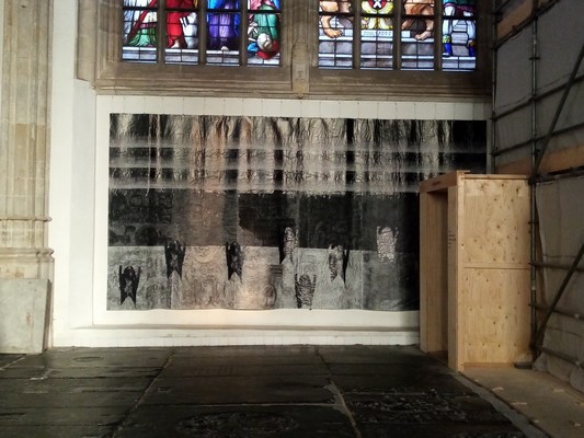 "........... en staan ze afgebeeld op een aantal van de houtskooltekeningen die in een paar nissen en geblindeerde kerkramen hangen ............."