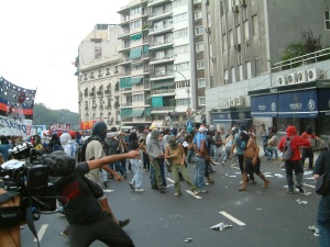 ".........Geheel onverwacht komt de tot dan toe uiterst rustig verlopen demonstratie tot leven. Vanuit de achterhoede worden stenen en verfbommetjes tegen de gevel van het Kavanagh gegooid, de gemaskerden gaan in de aanval. ............."