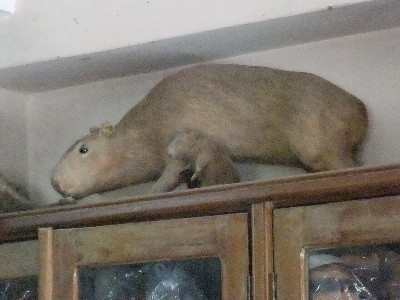 "........... De capibara, in mijn ogen een uit zijn krachten gegroeide rat, woont in deze natte gebieden. Dat is te zien in een winkel die we binnenlopen, daar staan een paar opgezette exemplaren op een uitstalkast ............."