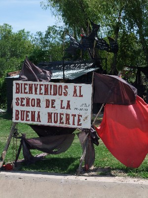 "........... Langs de weg staan zwarte vlaggen en een bord met “BIENVENIDOS AL SEÑOR DE LA BUENA MUERTE” ............."