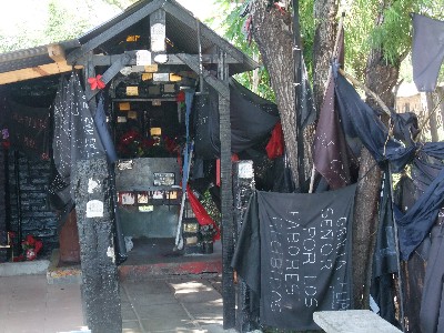 "........... wat van de weg af staat een zwart geverfd bouwsel, type volkstuinhuisje. ............."
