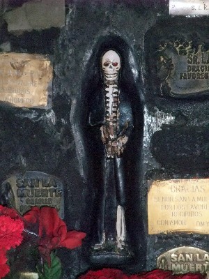 "........... Door de hele ruimte staan kleine skeletjes die zijn gekleed in een lange zwarte mantel met een monnikskap. Zo ziet deze heilige er dus uit in de verbeelding van zijn aanbidders. ............."