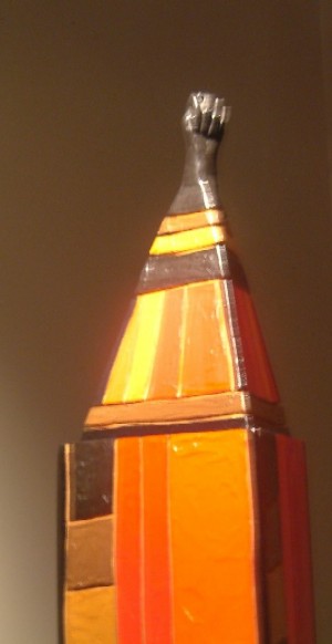 ".... . Intrigerend vind ik het gebruik van de Braziliaanse “figa - vuistje“ of een flinke kei als “bloem.” María legt me uit dat sommige werken van triplex zijn gemaakt waarin zij patronen heeft gegraveerd. "