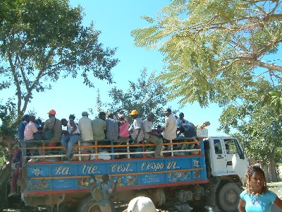"........... Af en toe hobbelt een vrachtwagen, met een open laadbak vol met mensen, voorbij. Openbaar vervoer in de ware zin van het woord. ............."