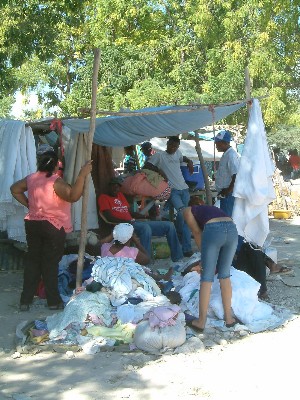 "........... Overwegend textiel dus in de “bend down boutiques”. Die zo heten omdat de klanten zich moet bukken om een keus te kunnen maken uit de stapels gebruikte kleding die slordig op een lap zeil op de grond liggen. ............."