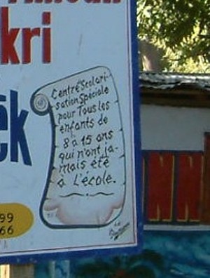 "........... Naast de tekst in het Kreyòl staat een kort tekstje in het Frans: “Speciaal Scholingscentrum voor alle kinderen van 8 – 15 jaar die nog nooit op school hebben gezeten”. Een redelijk zinloze oproep ............."