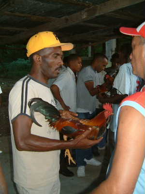 "............ Sommigen met een haan in de hand of tegen de borst geklemd. De gevederde vriend wordt aan een stuk door geliefkoosd, hij wordt geaaid of aan de staart geplukt. ................"