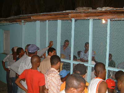 ".......... De hanen die gaan vechten, worden in een op een grote kippenren lijkend hok geprepareerd voor de strijd. Dat wil zeggen dat er scherpe puntige mesjes aan de poten worden bevestigd. ..............."