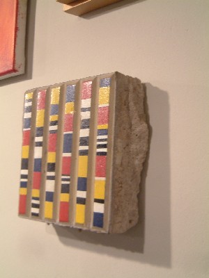 ".........een uit de straat gehakte tegel met een authentieke laag cement op de achterkant, waarvan de horizontale ribbels met verticale streepjes zijn beschilderd. Van dezelfde artiest hangt er voorts een ingelijst quiltwerkje, ..........."