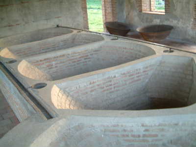 ".......... Erboven, op de eerste etage, zijn trog achtige uitsparingen gemetseld waarin de grote metalen schalen werden gezet om de de suiker te kristaliseren. Dat laatste veronderstel ik althans omdat er wat van die schalen naast staan. ..............."