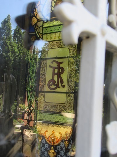 "........... en in de glas-in-loodramen in de zijmuren een verweven JR, van Jamin en Reuther ............."