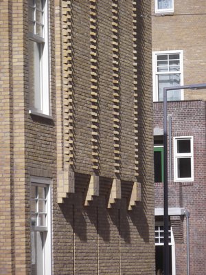 "........... Daar veranderen de hier en daar sierlijke patronen in het metselwerk uit de tijd dat de arbeidskosten laag waren, ............."