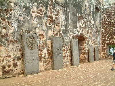 "........... Boven het stadhuis, ligt op een heuveltop de door de Portugezen gebouwde Sint Pauluskerk, waarvan alleen de buitenmuren nog overeind staan. In de resten van de kerk staan Nederlandse grafstenen tegen de muren: “Hieronder leyt begraven Reijnier D’Dieu. In syn leven oppercoopman in dienst der Ecomp. Overleden: den 7 Iuly A°1655.” ........."