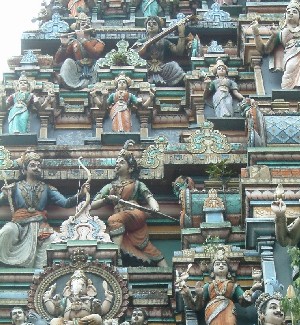 ".........Verder dan de ingang kom ik helaas niet “Tot 4 uur vanmiddag gesloten!” De buitenkant is echter zeer de moeite waard. Boven de hoofdingang is een soort piramide gebouwd die geheel en al met afbeeldingen van hindoegoden en godinnen is bekleed. Keramiek, zo te zien. Gek hoor al die godinnen met vier armen en de dankzij zijn olifantshoofd zeer herkenbare Ganesha, de god van het geluk en het succes, de opruimer van obstakels en daardoor waarschijnlijk de meest aanbeden godheid in India. ........... "