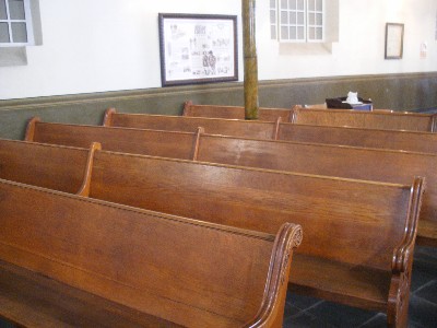 ".......... Rijen harde houten banken voor de preekstoel “gemaakt van uit Amerika geïmporteerd eikenhout” vertouwt de dame van dienst me toe. Die op de begane grond hebben tenminste een rugleunig, ............."