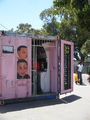 "........... Reeds bij het binnenrijden van de wijk zag ik de containers die waren omgebouwd tot winkels, kapsalons, overal kapsalons, en werkplaatsen. Net Awolowo Road en Falomo Square in Lagos. ............."