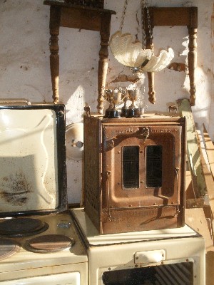 "........... Gestapelde afgedankte fornuizen, een verroeste draagbare oven - zo te zien een voorloper van de microwave - waarop sporttrofeeën staan te sudderen. ............."