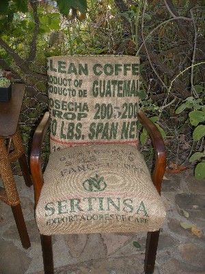 "........... Gereanimeerde meubels, een paar stoelen die zijn bekleed met afgedankte jute koffiezakken uit Mexio en Guatemala. ............."
