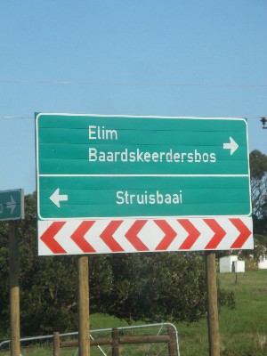 "........... Het dorp ligt ergens achter Bredasdorp, vlakbij Kaap Agulhas, de zuidelijkste punt van Afrika. Op de R319, op minder dan 40 kilometer van die Kaap, is een afslag naar rechts naar Elim en Baardskeerdersbos. ............."