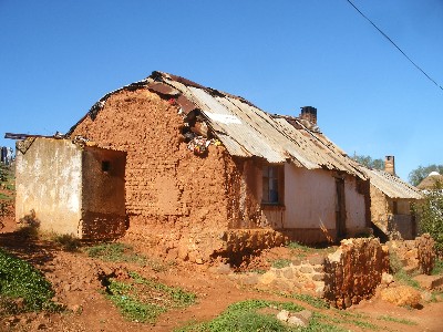 "........... De rieten daken zijn vervangen door golfplaten die echt golven omdat de balken eronder het niet lukt het dak te ondersteunen. ............."