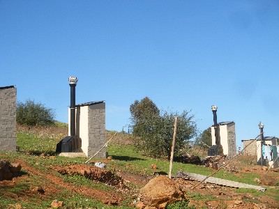 "........... Op een veldje staan kleine wiite bouwsels met aan de achterkant een soort schoorsteen met in de wind draaiende ventilatiekap erop. Het zijn de buitentoiletten, eentje voor ieder huis. ............."