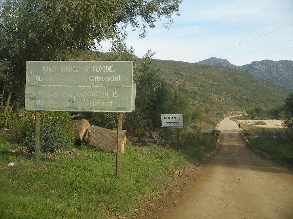 "........... Bij Kriedouwkrans de Olifantsrivier over via de weg – beton op lage paaltjes - die door de rivier loopt. Een doorwaadbare plaats op een verhoging, die in het Afrikaans zo mooi “een drif” heet. ............."
