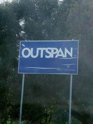 "........... Vlak voor Citrusdal staat een reclamebord voor Outspan, tijdens de apartheidsjaren een overal in Europa geboycot merk Zuid-Afrikaans fruit, net zoals er rond diezelfde tijd geen Angola koffie mocht worden gedronken. ............."