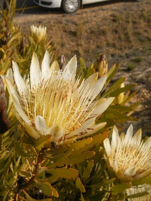 "........... Wat helpt, is dat de natuur, een week voordat de winter begint, alweer ontwaakt uit haar winterslaap. Ik parkeer de auto af en toe in de berm om de uitlopende protea’s – Zuid-Afrika’s nationale bloem – van dichterbij te bewonderen. ............."