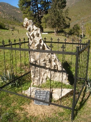 "........... Vlak na de ingang, afgesloten door zo’n hek dat bij een koeienweide hoort, staat een zwaar geërodeerde steen met een hekje erom heen. ............."