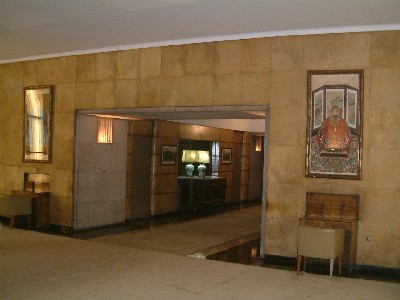 "...... De enorme, zacht verlichte hall heeft mooi betimmerde wanden en dikke tapijten op de vloeren. Er is een ontvangst- annex sleutelbalie met postvakjes, zoals in een hotel. Overal deuren, die liftdeuren blijken te zijn, oriëntaalse decoraties en marmeren beelden. Er heerst de voorname stilte van een voornaam gebouw............."