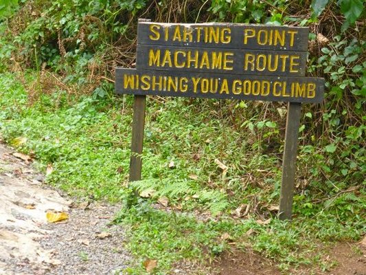 "........... Als alles geregeld is, beginnen we de klim om kwart voor drie, en het is dan nog een uur of vijf lopen naar het op 2.835 meter gelegen Machame Camp ............."