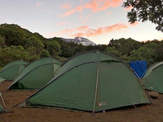 "........... Het is helder, we zien de top van de Kili afsteken tegen de blauwe lucht. ............."