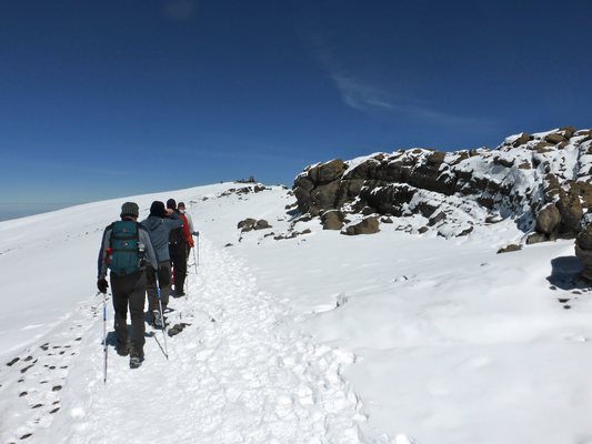 "........... Expeditieleider Marcel spoort ons aan om een besluit te nemen wie er door wil naar Uhuru Peak. Ik zeker wel! De laatste 140 hoogtemeters kunnen er nog wel bij, ............."