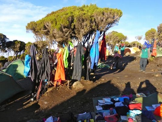 "........... terwijl onze gisteren nat geworden spullen drogen aan de bomen. ............."